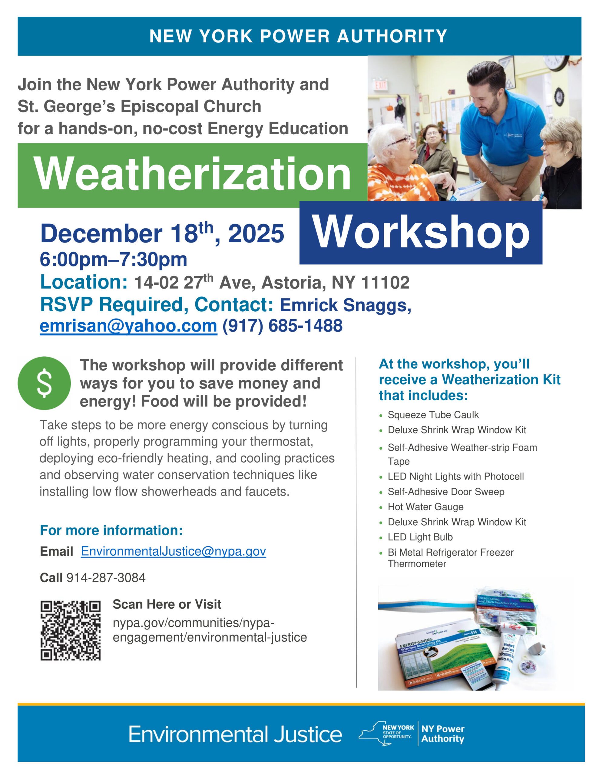 The New York Power Authority and St. George’s Episcopal Church are hosting a free, hands-on Weatherization Workshop on December 18, 2025, from 6:00–7:30pm at 14-02 27th Ave, Astoria.