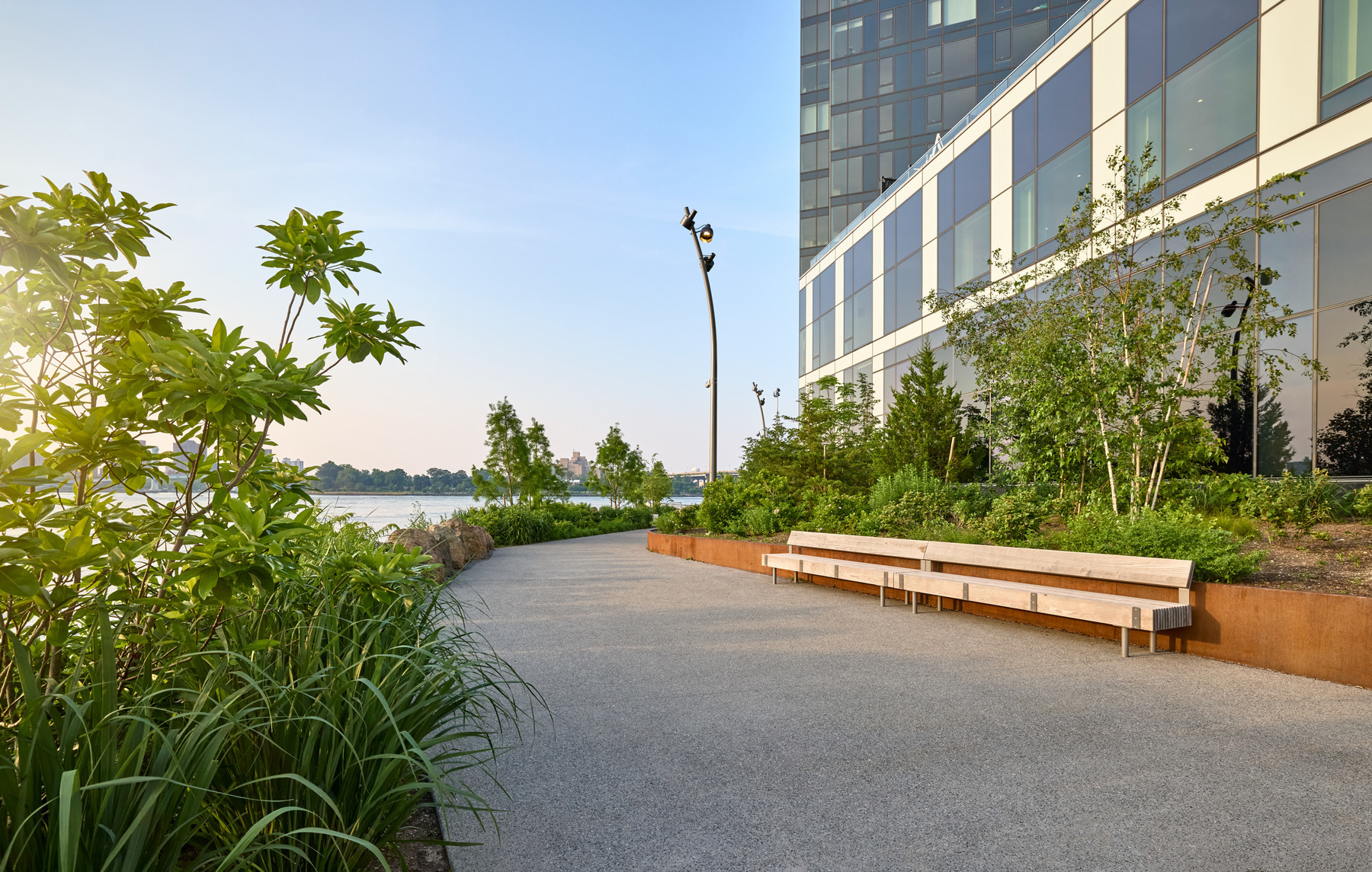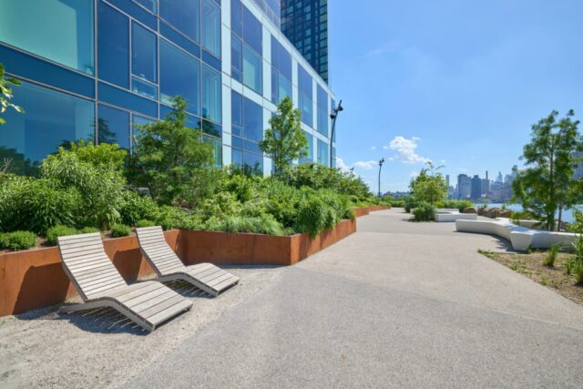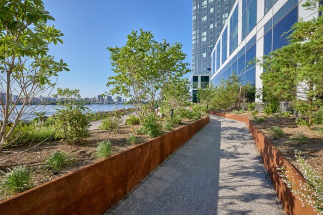 The esplanade features a great view of the Manhattan skyline, a nautically themed playground, picnic areas, and lots of seating. Featuring more than 70 trees and 700 native and adaptive plants, it provides visitors with a year-round connection to nature.