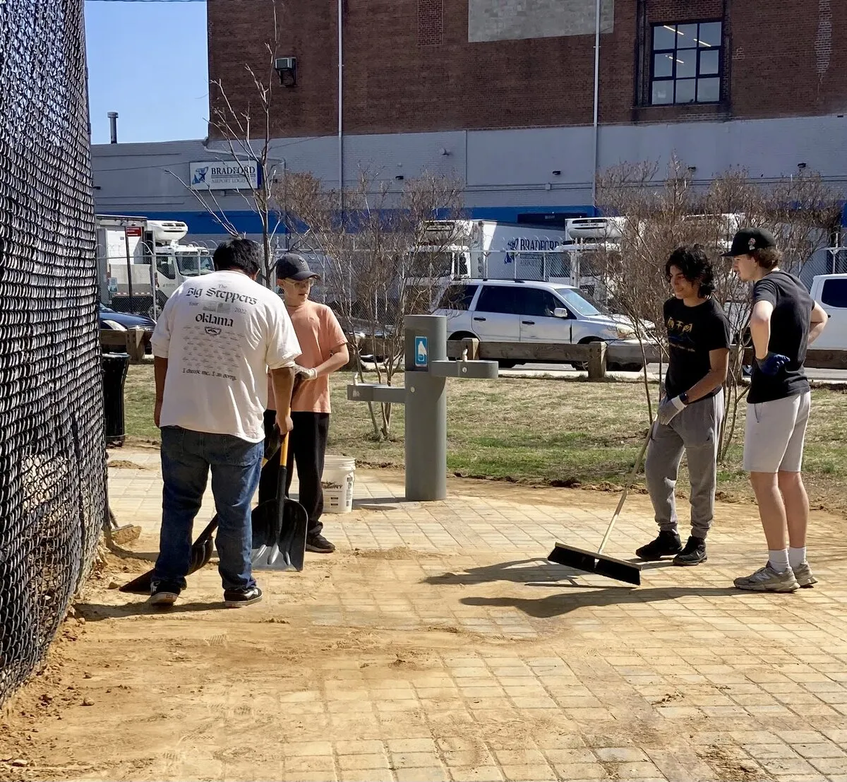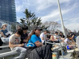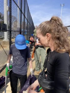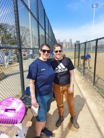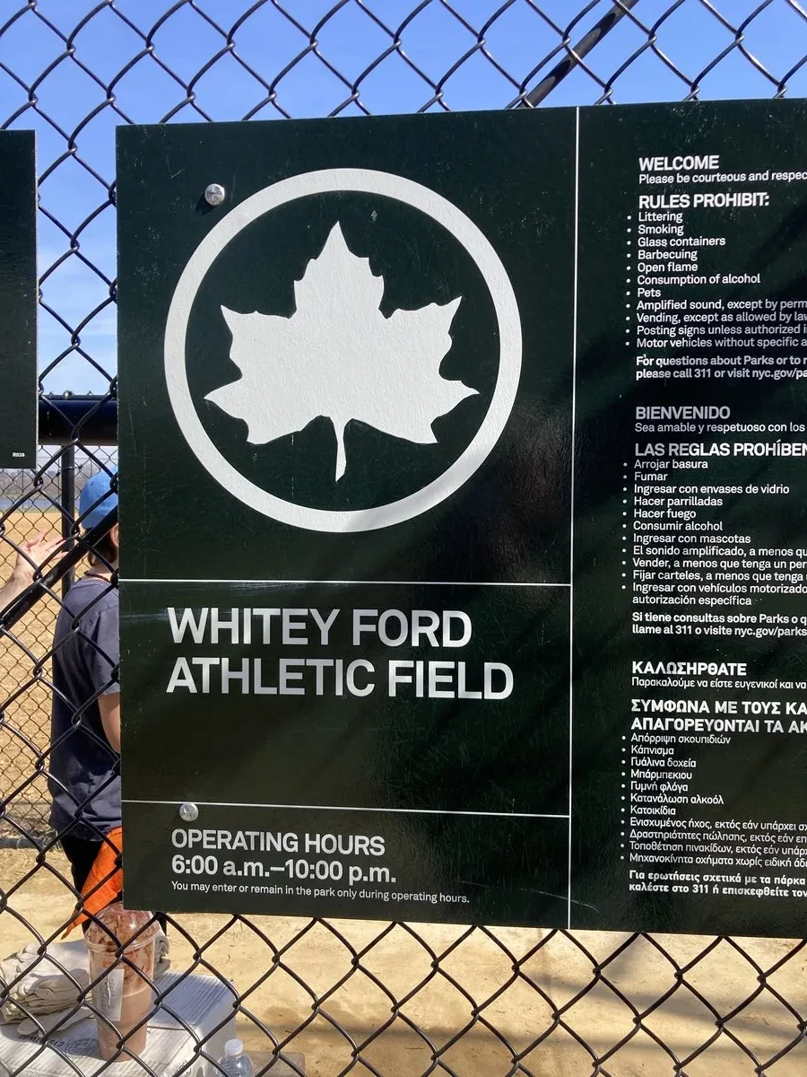 Friends of Whitey Ford Field promoted the cleanup through social media and LinkNYC kiosks, expecting 20–30 volunteers—but turnout far exceeded expectations. Participants included teams from Frank Sinatra High School of the Arts, NYC Rising Stars, East River Sharks, and FDNY’s Youth Explorer Program. A DOT representative also presented on the Queens Greenway Project with support from the Queens Borough President’s office.