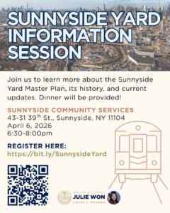 The session will include a refresher on the Sunnyside Yard master plan, its history, and its current status. Attendees will also be able to engage directly with organizers and officials during a Q&A portion.